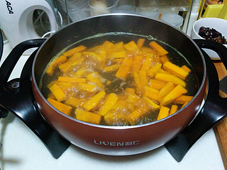 3、锅内加水烧开,倒入切好的南瓜煮约2分钟