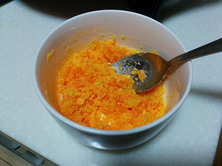 2. 我这里用的是之前做月饼用剩的烘焙用咸蛋黄,味道很好而且不是很咸,所以后来我还加了些盐来调味;如果用的蛋黄本身就已经很咸了的话,后期就不需要再加盐了。