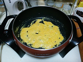 7、锅内倒入少许油,烧热后倒入碾成泥的蛋黄